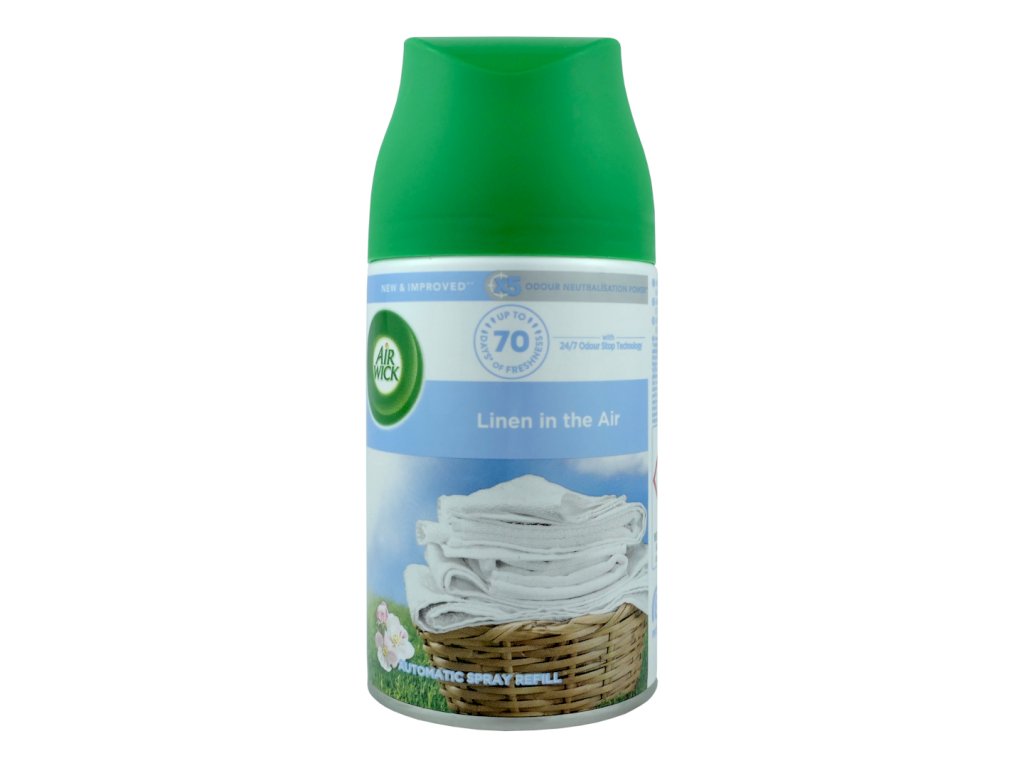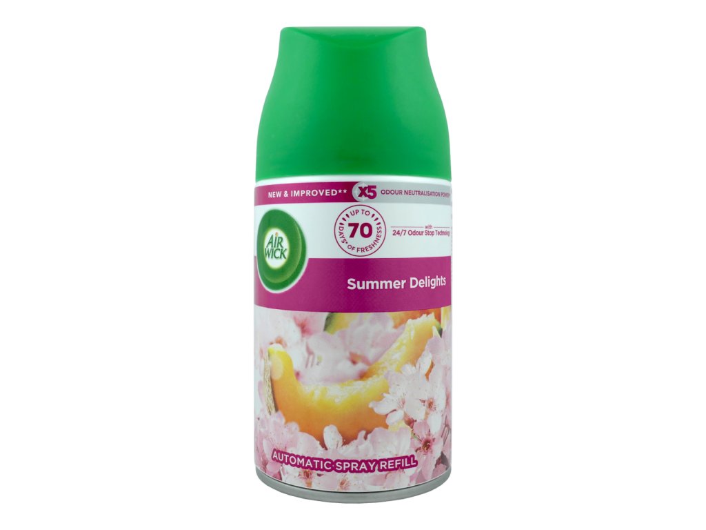 Oblíbený osvěžovač vzduchu AIRWICK ve formě bezkapénkového aerosolu je vhodný pro použití do difuzérů - automatických dávkovačů vzduchu AIRWICK FRESHMATIC nebo samostatně jako osvěžovač vzduchu ve spreji. Nádherné a intenzivní vůně prostoupí prostor kolem Vás jak ve Vašem obýváku, kanceláři i na toaletě. Budete se tak cítit příjemně a svěže. Čistá vůně po sobě nezanechává žádné kapénky jako běžný osvěžovač ve spreji. Můžete si tak užívat intenzivní zážitek z vůní v klidu a pohodě. Balení obsahuje 1ks náplně o objemu 250ml.