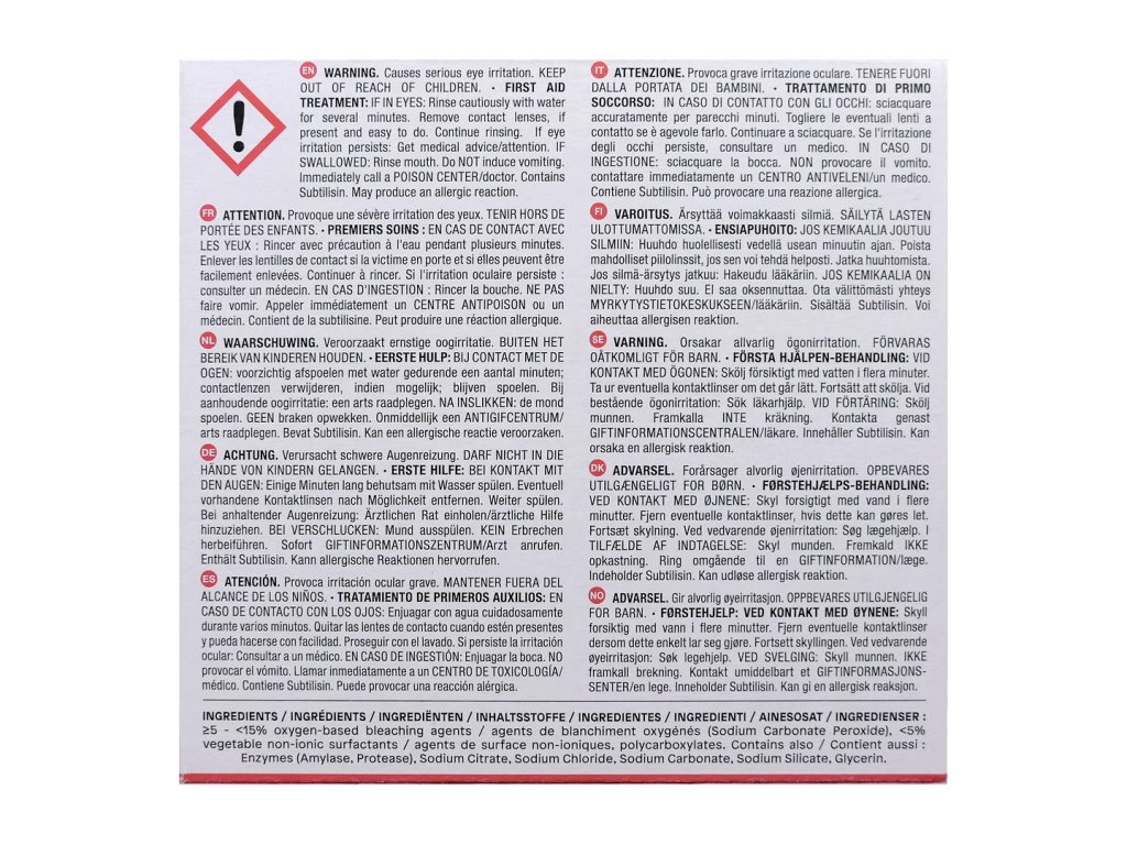 Upozornění na štítku | POZOR: Dráždivý. VAROVÁNÍ. Způsobuje vážné podráždění očí. Uchovávejte mimo dosah dětí. Bezpečnostní pokyny - první pomoc: PŘI ZASAŽENÍ OČÍ: Několik minut opatrně vyplachujte vodou. Vyjměte kontaktní čočky, jsou-li nasazeny a pokud je lze vyjmout snadno. Pokračujte ve vyplachování. Přetrvává-li podráždění očí: Vyhledejte lékařskou pomoc/ošetření. PŘI POŽITÍ: Vypláchněte ústa vodou. Nevyvolávejte zvracení. Okamžitě volejte TOXIKOLOGICKÉ INFORMAČNÍ STŘEDISKO/lékaře. Je-li nutná lékařská pomoc, mějte po ruce obal nebo štítek výrobku. Obsahuje Subtilisin. Může vyvolat alergickou reakci. Složení: ≥5 - <15% bělidla na bázi kyslíku (Sodium Carbonate Peroxide), <5% rostlinné neiontové povrchově aktivní látky, polykarboxyláty. Dále obsahuje: enzymy (Amylase, Protease), Sodium Citrate, Sodium Chloride, Sodium Carbonate, Sodium Silisate, Glycerin. |
