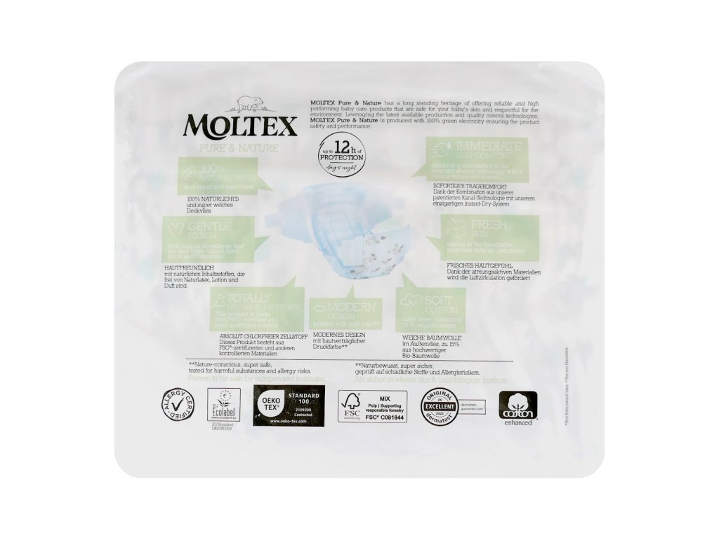 MOLTEX Pure&Nature má dlouholetou tradici v poskytování spolehlivých a vysoce účinných produktů péče o děti, které jsou bezpečné pro pokožku Vašeho dítěte a šetrné k životnímu prostředí. Díky využití nejnovějších dostupných technologií výroby a kontroly kvality je MOLTEX Pure&Nature vyráběn ze 100% zelené elektřiny, což zajišťuje bezpečnost a efektivitu produktů.