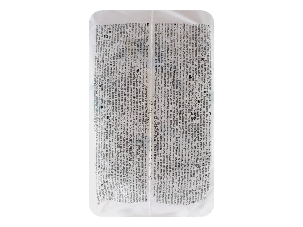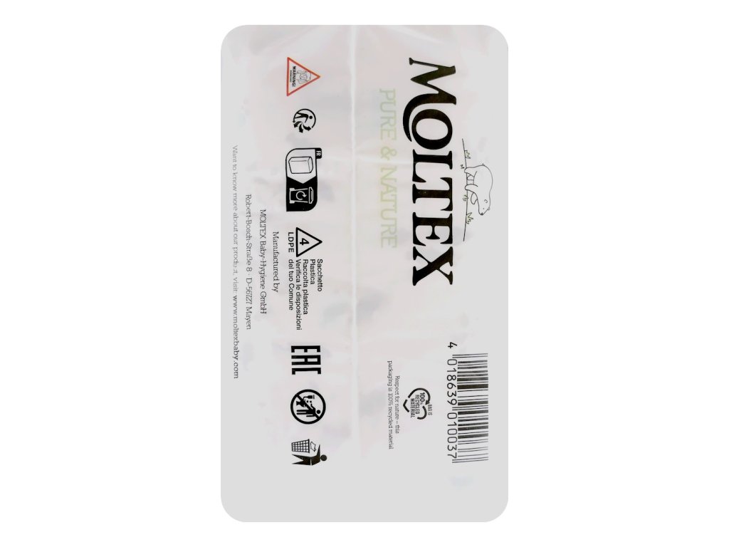 | Upozornění na štítku | Jednorázové dětské plenky Moltex Pure&Nature. Neobsahují umělé parfémy, latex ani chlór. Datum spotřeby uvedeno na obalu. - Vyrobeno v EU.Vyprázdněný obal recyklujte - LDPE 4. |