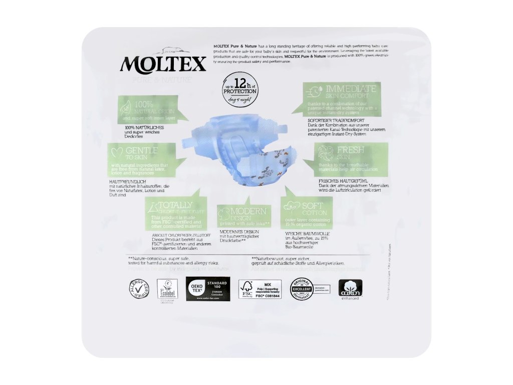 MOLTEX Pure&Nature má dlouholetou tradici v poskytování spolehlivých a vysoce účinných produktů péče o děti, které jsou bezpečné pro pokožku Vašeho dítěte a šetrné k životnímu prostředí. Díky využití nejnovějších dostupných technologií výroby a kontroly kvality je MOLTEX Pure&Nature vyráběn ze 100% zelené elektřiny, což zajišťuje bezpečnost a efektivitu produktů.