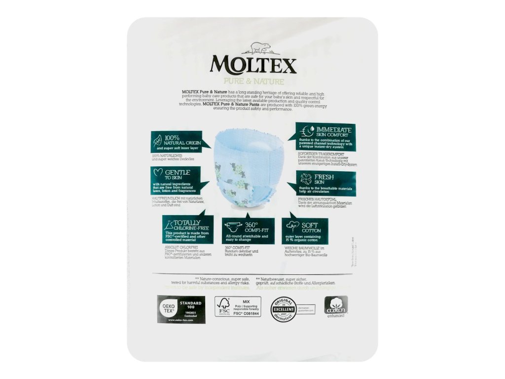 MOLTEX Pure&Nature má dlouholetou tradici v poskytování spolehlivých a vysoce účinných produktů péče o děti, které jsou bezpečné pro pokožku Vašeho dítěte a šetrné k životnímu prostředí. Díky využití nejnovějších dostupných technologií výroby a kontroly kvality je MOLTEX Pure&Nature vyráběn ze 100% zelené elektřiny, což zajišťuje bezpečnost a efektivitu produktů.
