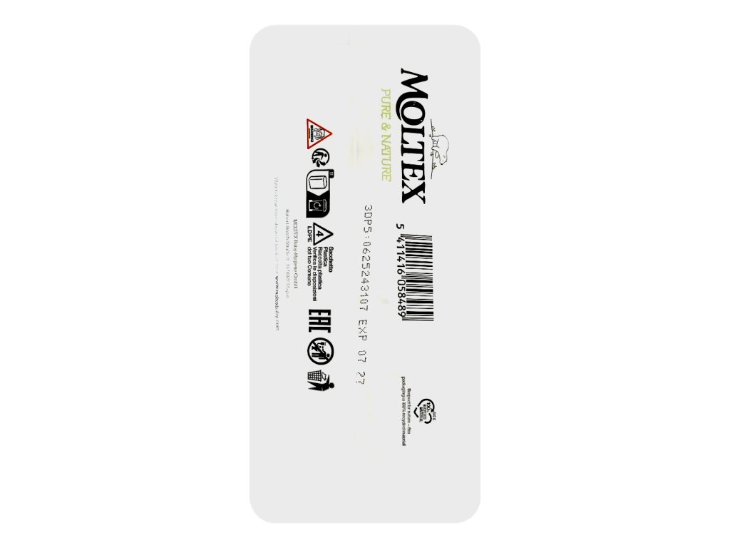 Upozornění na štítku | Jednorázové dětské plenky Moltex Pure&Nature. Neobsahují umělé parfémy, latex ani chlór. Datum spotřeby uvedeno na obalu. - Vyrobeno v EU.Vyprázdněný obal recyklujte - LDPE 4. |
