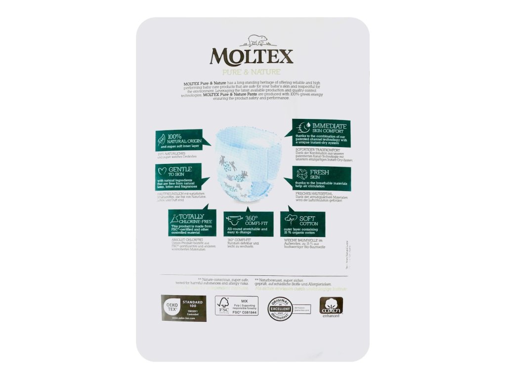 MOLTEX Pure&Nature má dlouholetou tradici v poskytování spolehlivých a vysoce účinných produktů péče o děti, které jsou bezpečné pro pokožku Vašeho dítěte a šetrné k životnímu prostředí. Díky využití nejnovějších dostupných technologií výroby a kontroly kvality je MOLTEX Pure&Nature vyráběn ze 100% zelené elektřiny, což zajišťuje bezpečnost a efektivitu produktů.