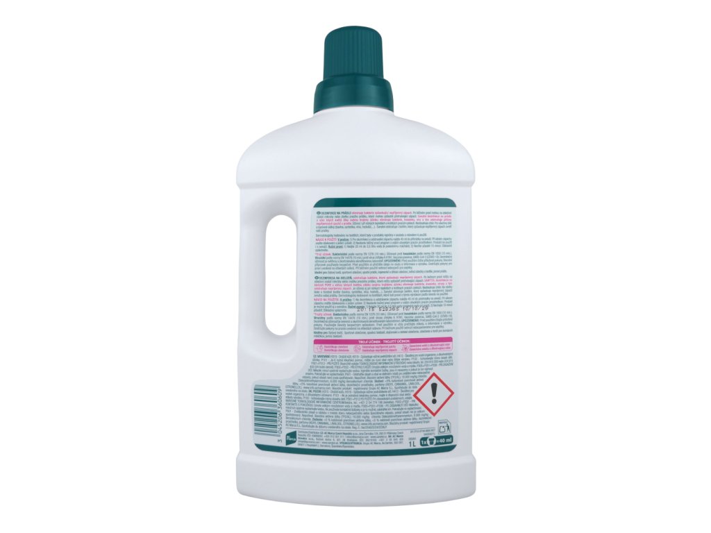 | Upozornění na štítku | VAROVÁNÍ: Dráždí kůži. Způsobuje vážné podráždění očí. Škodlivý pro vodní organismy, s dlouhodobými účinky. Je-li nutná lékařská pomoc, mějte po ruce obal nebo štítek výrobku. Uchovávejte mimo dosah dětí. PŘI POŽITÍ: Okamžitě volejte TOXIKOLOGICKÉ INFORMAČNÍ STŘEDISKO nebo lékaře. PŘI STYKU S KŮŽÍ: Omyjte velkým množstvím vody a mýdla. PŘI ZASAŽENÍ OČÍ: Několik minut opatrně vyplachujte vodou. Vyjměte kontaktní čočky, jsou-li nasazeny a pokud je lze vyjmout snadno. Pokračujte ve vyplachování. Odstraňte obsah a obal ve sběrném místě pro zvláštní nebo nebezpečné odpady, pokud obsah není zcela spotřebován. Nepožívat. Biocidní látky (TP2/AL): 18.000mg/kg chloridu Didecyldimethylammonium, 6.000mg/kg Benzalkonium chloride. Složení: <5% kationtové povrchově aktivní látky, <5% neiontové povrchově aktivní látky. Dezinfekční prostředky a parfémy (BENZYL SALICYLATE). Spotřebujte do data uvedeného na obalu. |